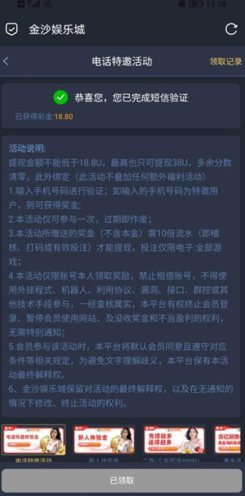 我是接到的电话,短信验证通过直接到账18.8u.,