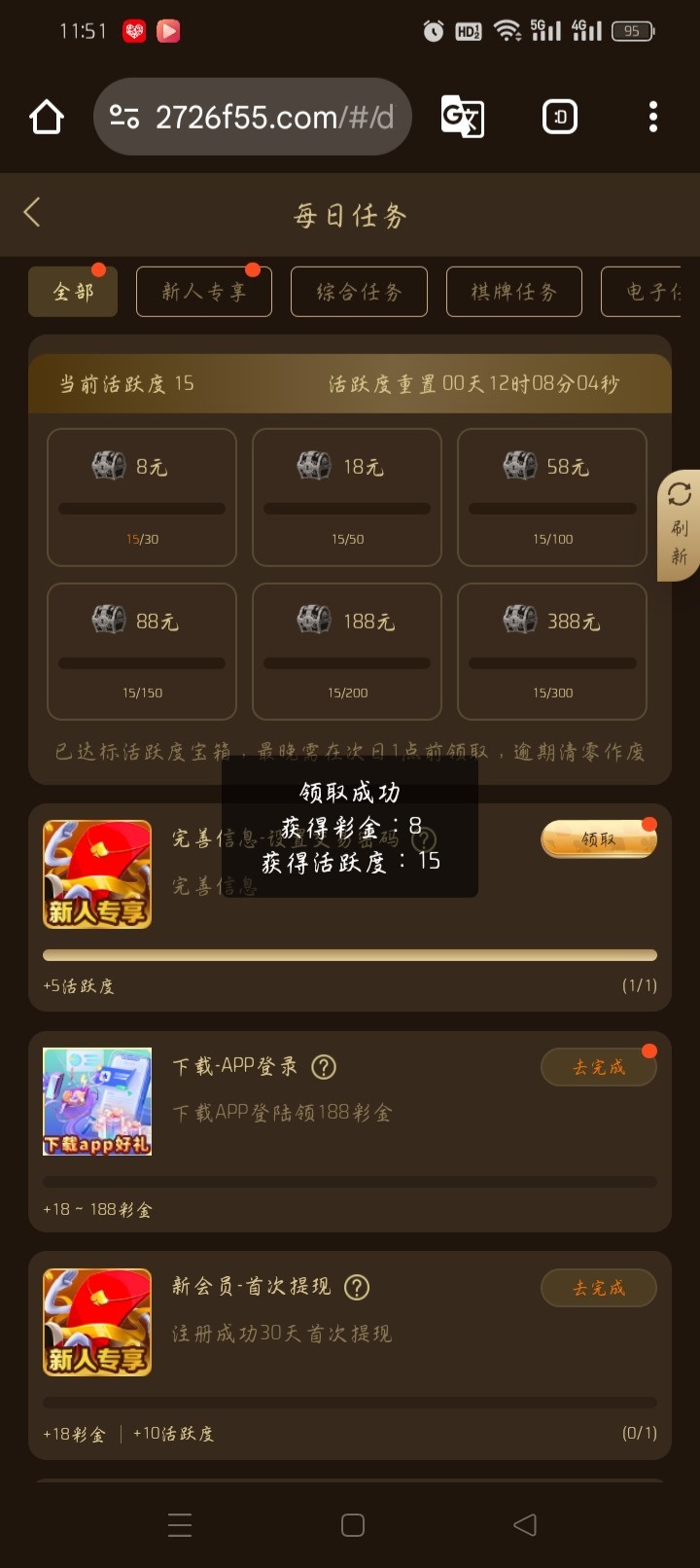 每日任务里面完善信息送8,每天100名额现在还有名额,没有的晚上12点领取