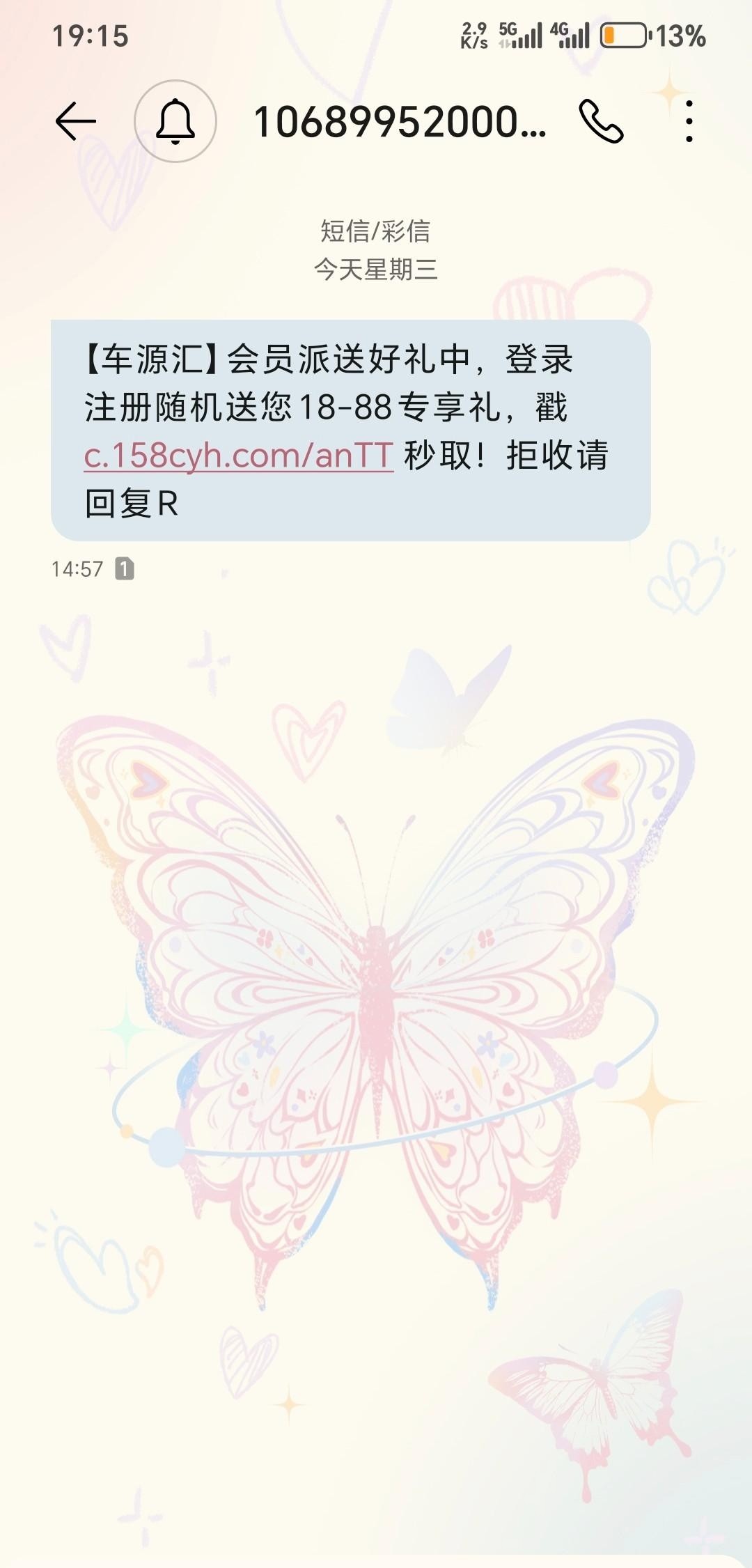 短信内容【车源汇】会员派送好礼中,登录注册随机送您18-88专享礼,戳 c.158cyh.com/anTT 秒取!拒收请回复R